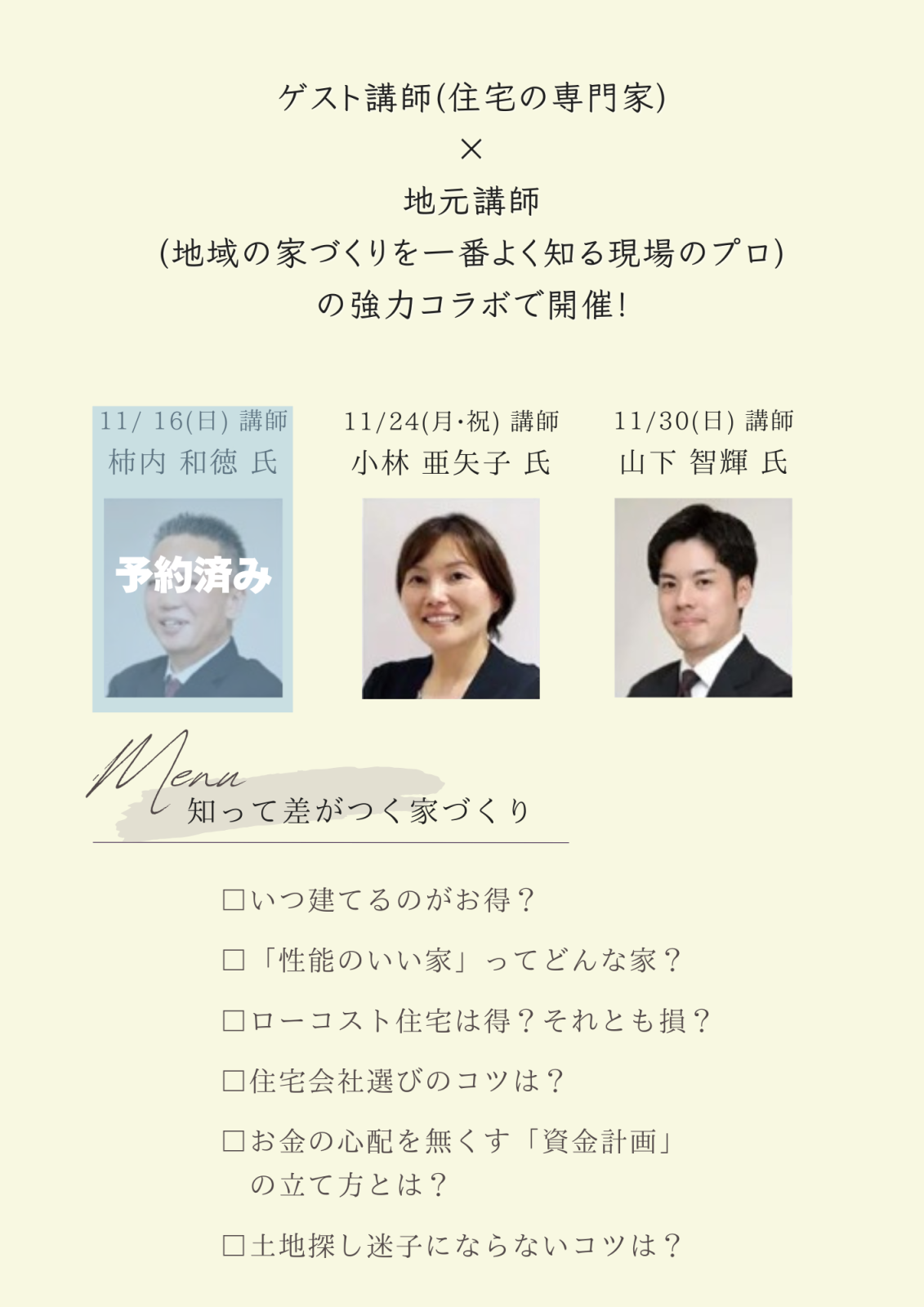 家づくりの「何から始めればいいの ??」という初歩的な疑問から、失敗しないための進め方や考え方・気をつけるべき点などを分かりやすくお伝えしている講座です(*Ü*)ノ